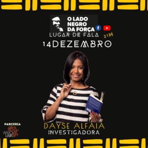 Apresentamos os dias de Lugar de Fala do mês de dezembro. Dia 14 recebemos a Investigadora Dayse Alfaia e no dia 28 de Dezembro terminamos